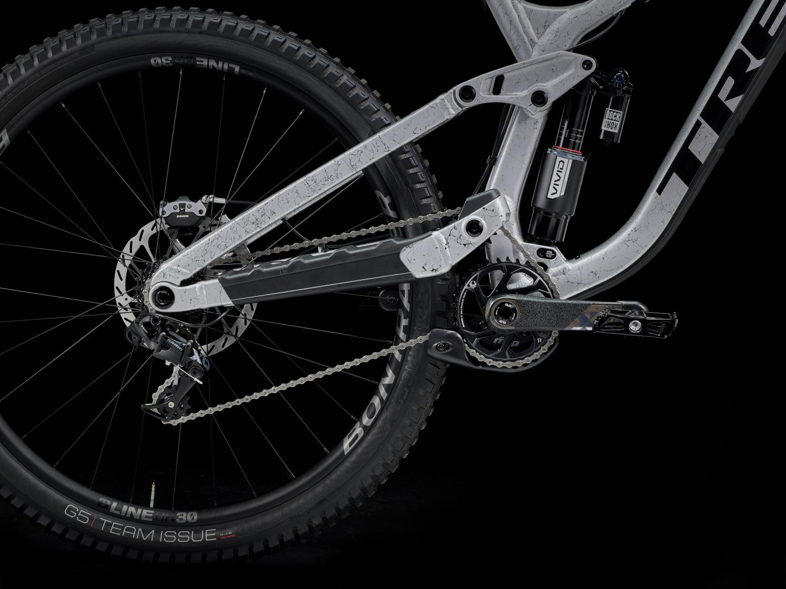 - Das neue Fahrwerkslayout mit hohem Dreh- und Umlenkpunkt verbessert die Traktion, unterstützt höhere Geschwindigkeiten und reduziert den Pedalrückschlag für mehr Stabilität.