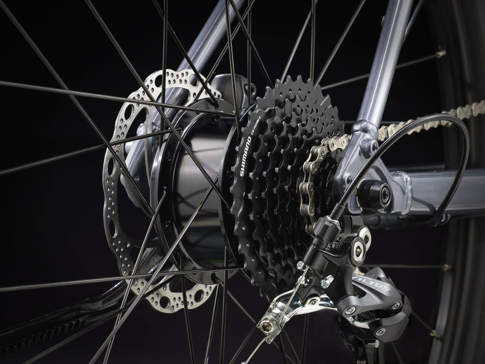 Einen leichten Aluminiumrahmen mit Stagger-Design zum einfachen Auf- und Absteigen, Treks hauseigenes Antriebssystem mit Nabenmotor mit 250 W Leistung und 40 Nm Drehmoment zur natürlichen Tretunterstützung bis 25 km/h und einen 250 Wh starken Akku für bis zu 55 km Reichweite pro Ladung. Dazu gibt es steife 650B-Laufräder mit breiten 50C-Reifen zur Verbesserung von Geländegängigkeit und Komfort in abwechslungsreichem Terrain, eine zuverlässige 9-Gang-Schaltung von Shimano, hydraulische Scheibenbremsen, eine integrierte, akkugespeiste Beleuchtung und einen Seitenständer.