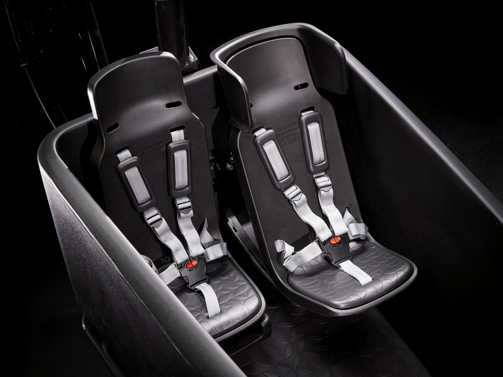 - Die mitgelieferten zwei Kindersitze kommen mit 5-Punkt-Gurten, stabilisierenden Kopfstützen und ermöglichen drei Rückenlehnenpositionen (aufrecht, Chill-Modus und Schlafstellung).
