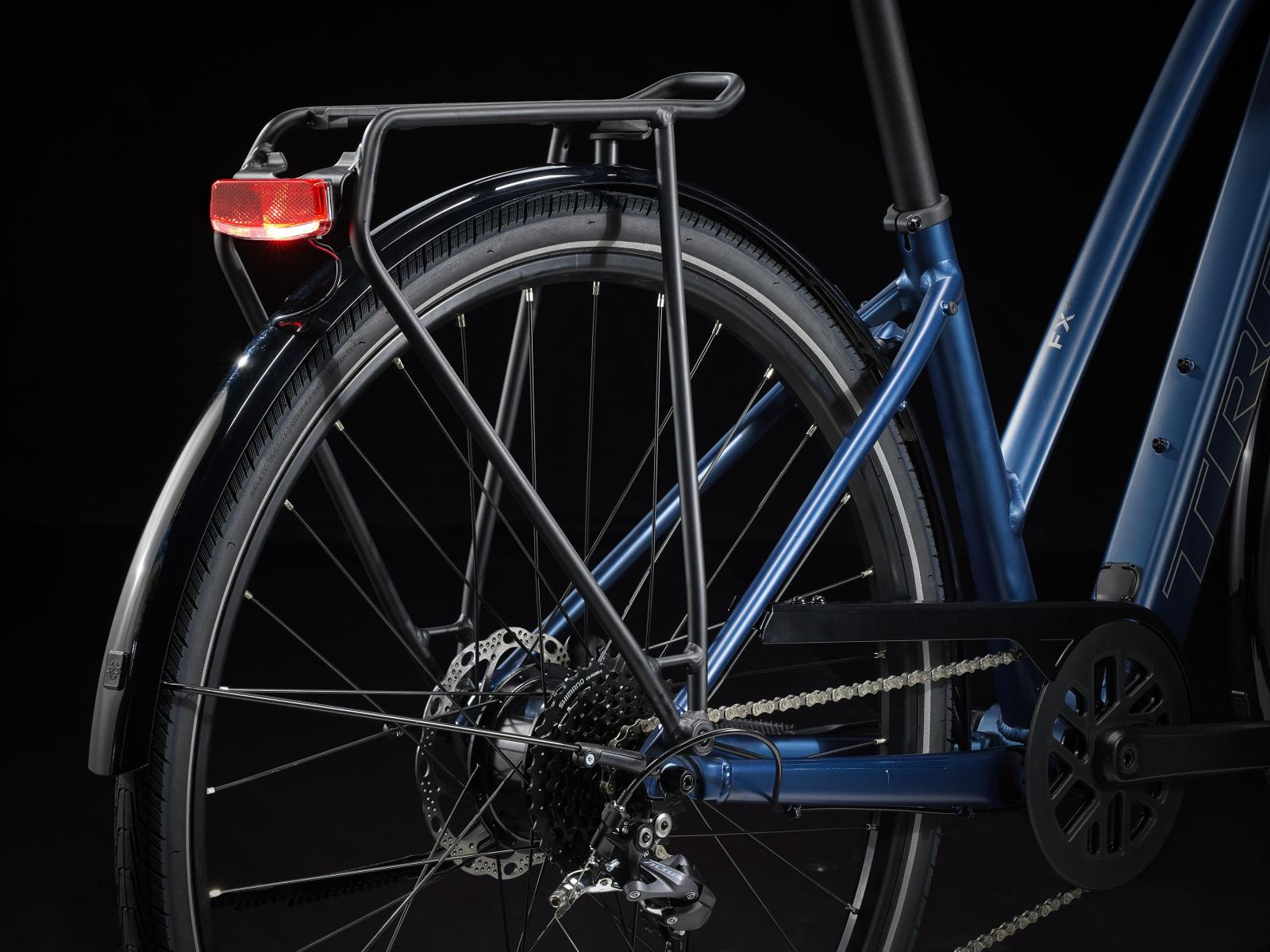 Einen leichten Aluminiumrahmen mit Stagger-Design zum einfachen Auf- und Absteigen, Treks hauseigenes Antriebssystem mit Nabenmotor mit 250 W Leistung und 40 Nm Drehmoment zur natürlichen Tretunterstützung bis 25 km/h und einen 250 Wh starken Akku für bis zu 56 km Reichweite pro Ladung. Außerdem bekommst du schnelle 700C-Laufräder und leicht rollende, aber fahrstabile 40C-Reifen mit reflektierenden Flanken, eine zuverlässige Shimano-Schaltung mit 9 Gängen, hydraulische Scheibenbremsen, eine integrierte, akkugespeiste Beleuchtung, einen MIK-kompatiblen Heckgepäckträger, Schutzbleche und einen Seitenständer.