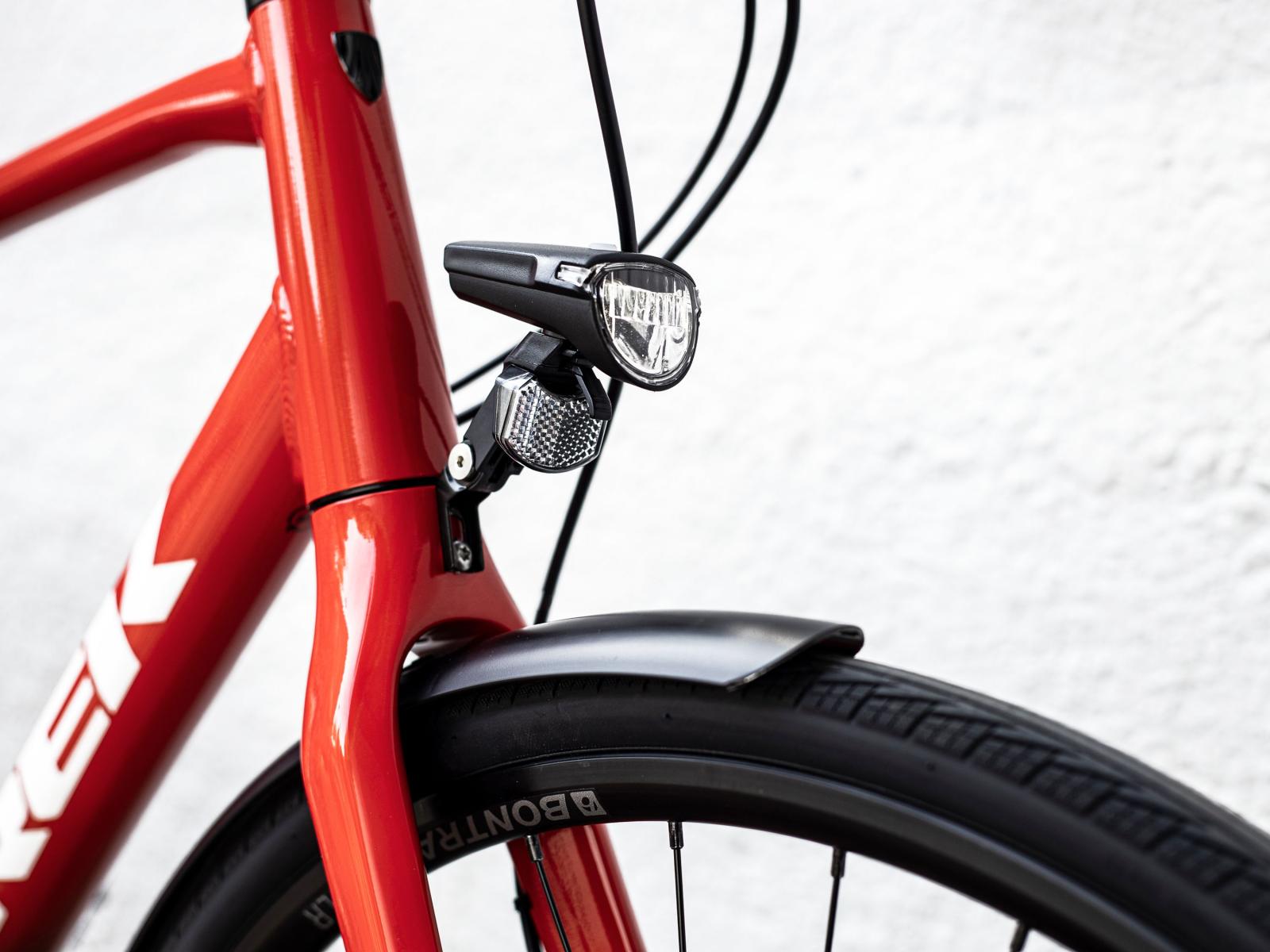 Einen leichten Aluminiumrahmen, eine Carbongabel und hydraulische Scheibenbremsen für zuverlässige Bremsleistung bei jedem Wetter. Dazu gibt‘s einen 1x-Antrieb, der einen Umwerfer überflüssig macht und so zum aufgeräumten Look und zur intuitiven Bedienung des Bikes beiträgt. Aber keine Sorge: Mit der breiten Übersetzungsspanne der 11-46-Kassette stehen dir mehr als genug Gänge für deftige Anstiege und rasante Abfahrten zur Verfügung. Außerdem kommt es mit Scheinwerfer und Rücklicht, Schutzblechen, Heckgepäckträger, pannenresistenten Reifen und einem vibrationsdämpfenden Lenker samt ergonomischen Griffen.