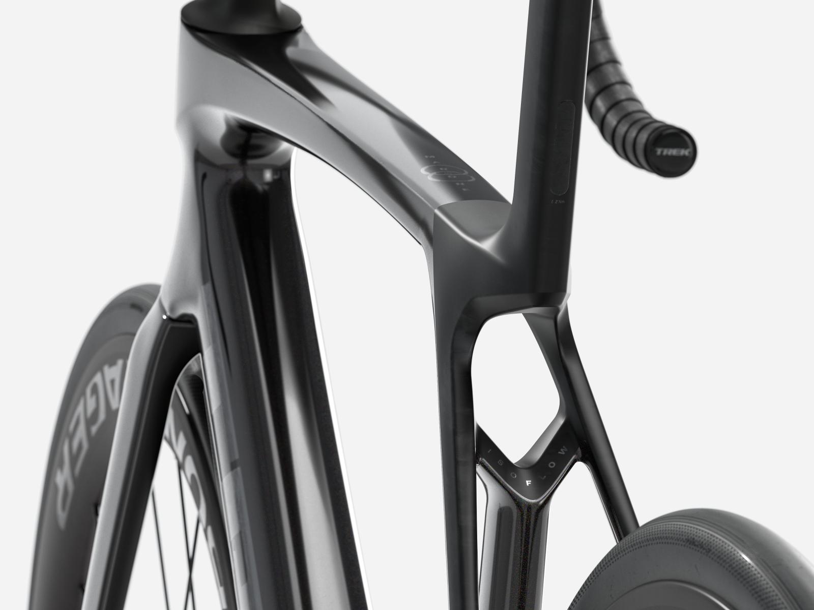 Gabel: Madone Gen 8, Vollcarbon, konischer Carbongabelschaft, interne Bremsleitungsführung, Flat Mount Scheibenbremsaufnahme, abgeschrägte 12 x 100 mm Steckachse