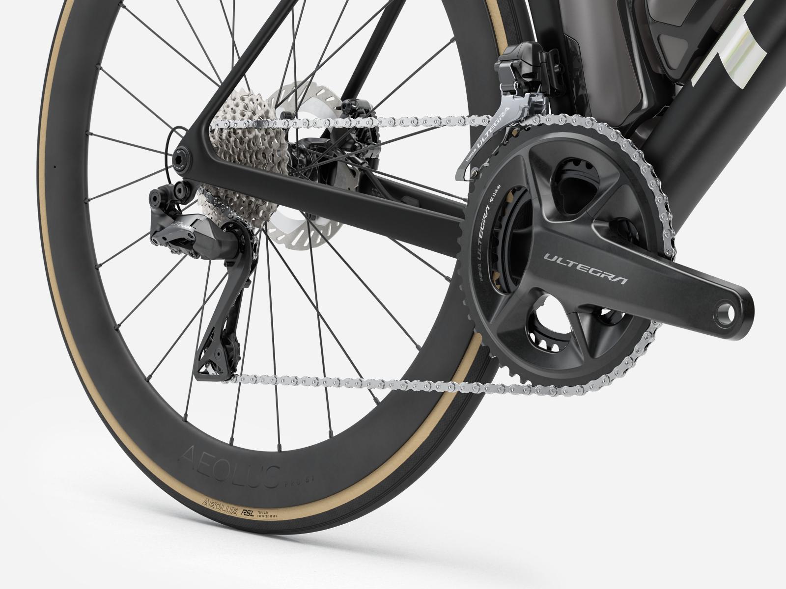 Einen unglaublich leichten, aerodynamisch optimierten Rahmen aus unserem besten 900 Series OCLV Carbon samt IsoFlow-Komforttechnologie und Watt-sparenden RSL Aero Trinkflaschen und Flaschenhaltern. Einen blitzschnell schaltenden Shimano Ultegra Di2 2x12-Antrieb, der sich individuell programmieren lässt, während das verbaute, weit verbreitete Universalschaltauge (UDH) die Ersatzteilbeschaffung erleichtert. Abgerundet wird die Ausstattung von schlauchlosen Bontrager Aeolus Pro 51 Carbonlaufrädern und einer einteiligen Trek Aero RSL Lenker/Vorbau-Einheit.