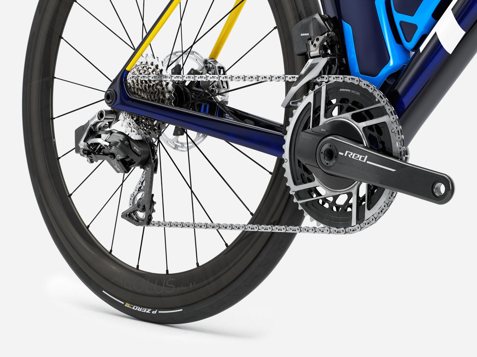 Einen unglaublich leichten, aerodynamisch optimierten Rahmen aus unserem besten 900 Series OCLV Carbon samt IsoFlow-Komforttechnologie und Watt-sparenden RSL Aero Trinkflaschen und Flaschenhaltern. Dazu gibts SRAMs neuesten ultraleichten RED AXS E1 Antrieb samt Powermeter für datengestützte Trainingsrunden, während das verbaute, weit verbreitete Universalschaltauge (UDH) die Ersatzteilbeschaffung erleichtert. Abgerundet wird die Ausstattung von schlauchlosen Bontrager Aeolus RSL 51 Carbonlaufrädern und einer einteiligen Trek Aero RSL Lenker/Vorbau-Einheit.