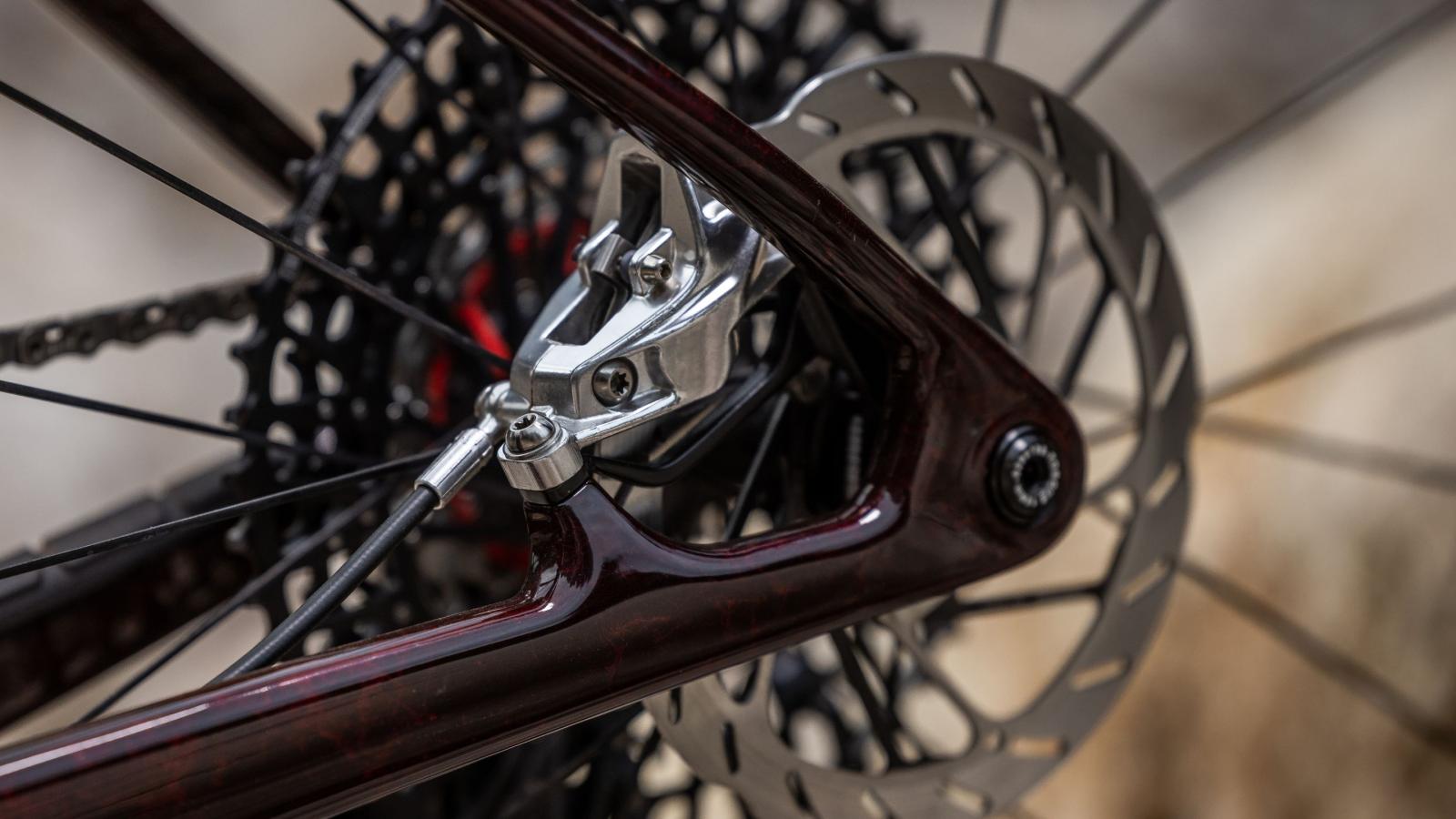 Statt an der Sitzstrebe ist der Bremssattel an einer Verlängerung der Hinterachse montiert, sodass die Sitzstrebe flexen und Unebenheiten auf dem Trail absorbieren kann, ohne die konstante und gut dosierbare Bremsleistung zu beeinträchtigen.