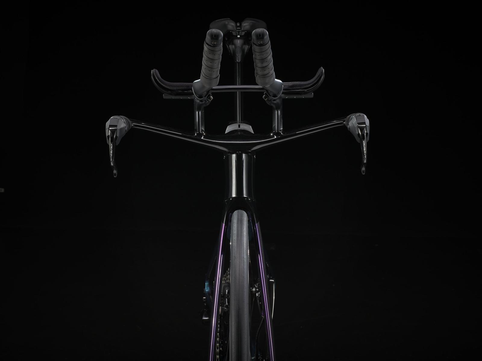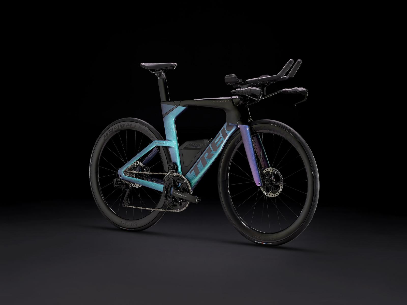 Einen ultraleichten Rahmen aus 800 Series OCLV Carbon samt windschnittigen KVF-Rohrprofilen (Kammtail Virtual Foil), eine aerodynamische Speed Concept-Carbongabel, straßenglättendes IsoSpeed und eine integrierte Aufbewahrungslösung für Verpflegung, Flüssigkeit und Pannenkit. Außerdem bekommst du einen elektronischen Shimano Dura-Ace 12fach-Drahtlosantrieb, eine vollständig integrierte Lenker/Vorbau-Einheit, einen triathlonspezifischen Bontrager Hilo Pro Carbonsattel für eine aggressive Aero-Sitzposition, Scheibenbremsen für zuverlässige Bremsleistung und aerodynamische Bontrager Aeolus RSL 51 Laufräder aus OCLV Carbon.