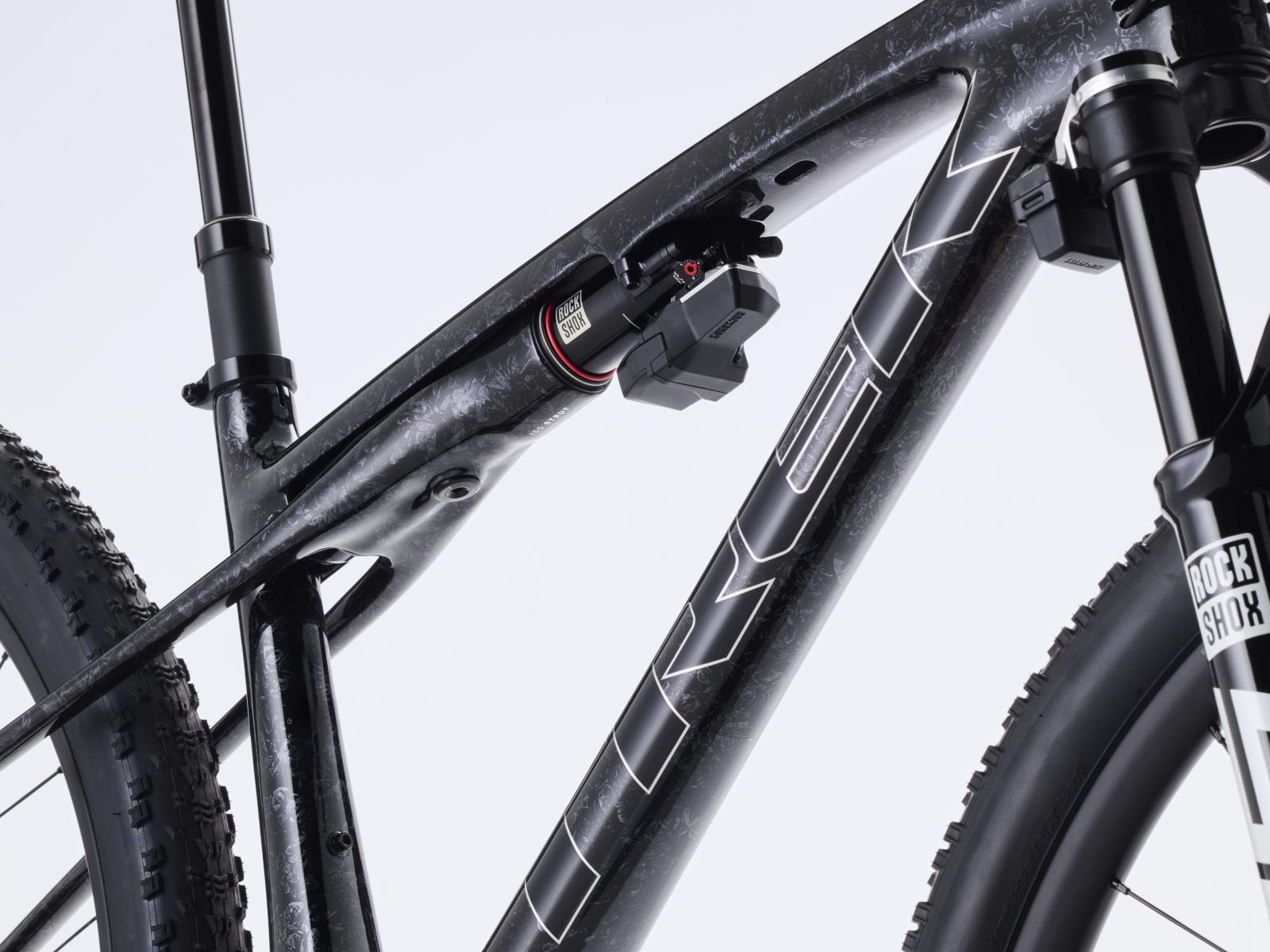 Einen federleichten Rahmen aus hochmoduligem SLR OCLV Mountain Carbon mit moderner XC-Geometrie. Außerdem bekommst du eine RockShox SID SL Ultimate 110-mm-Federgabel mit DebonAir Federung und Charger Race Day Dämpfung und einen RockShox SIDLuxe IsoStrut 80-mm-Hinterbaudämpfer – natürlich komplett mit Flight Attendant Technologie von RockShox. Eine ultraleichte, komplett drahtlose elektronische SRAM X0 AXS 12fach-Transmission, Bontrager Kovee RSL Carbonlaufräder, eine integrierte Bontrager RSL Lenker/Vorbau-Einheit aus Carbon, eine drahtlose RockShox Reverb AXS Variosattelstütze und hydraulische SRAM Motive Silver 4-Kolben-Scheib