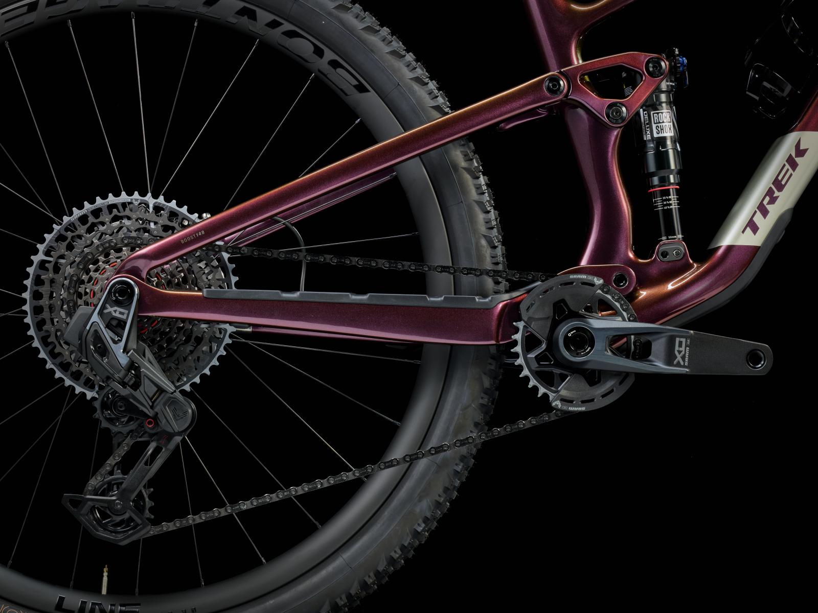 Einen Rahmen aus OCLV Mountain Carbon mit vierfach verstellbarem Mino Link an der unteren Dämpferaufnahme zur Feinanpassung der Rahmengeometrie und des Hebelverhältnisses des Fahrwerks. Eine RockShox Pike Ultimate Gabel mit 130 mm Federweg, DebonAir Luftfeder und Charger 3.1 RC2 Dämpfung sowie einen RockShox Deluxe Ultimate RCT Hinterbaudämpfer mit 120 mm Federweg. Abgerundet wird die Ausstattung von einer drahtlosen SRAM X0 AXS Transmission, hydraulischen SRAM Level Silver Stealth 4-Kolben-Scheibenbremsen, einer RockShox Reverb AXS Variosattelstütze und Bontrager Line Pro 30 Tubeless-Ready-Carbonlaufrädern.
